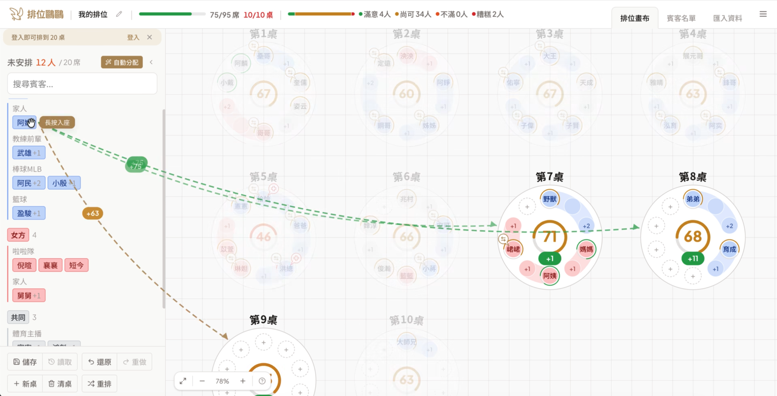 當你拖曳調整座位時,分數即時更新,讓你一眼看清誰坐得最開心、誰的安排還需要優化——不再靠感覺猜,而是用數據說話。