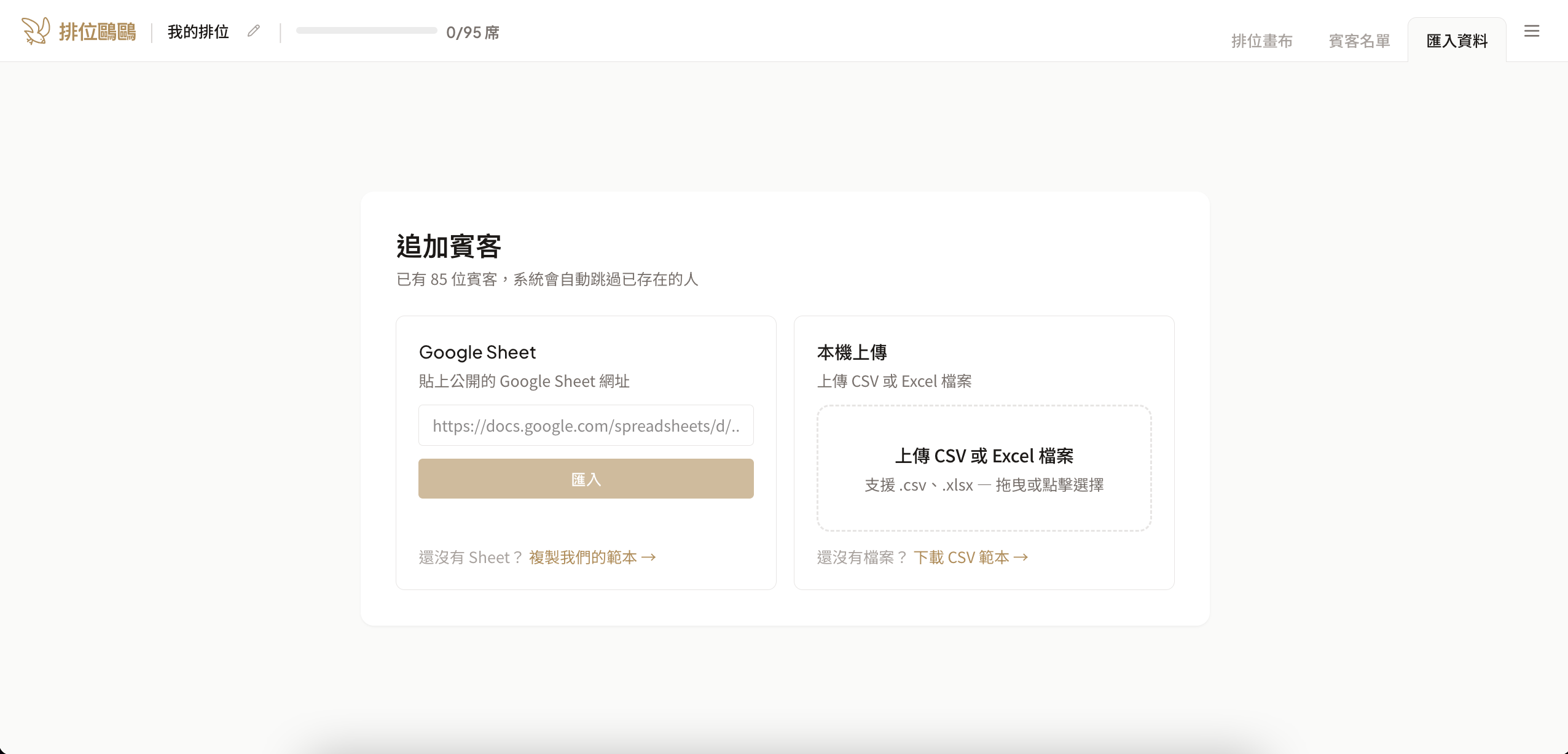 Seatern 支援直接匯入 Excel 或 Google Sheets,系統會自動偵測姓名、賓客類別與關係分數,瞬間將雜亂的名單轉換為可視化的婚禮座位表。對於已經在 Excel 管理賓客清單的新人來說,這一步可以省下大量的前置作業時間。